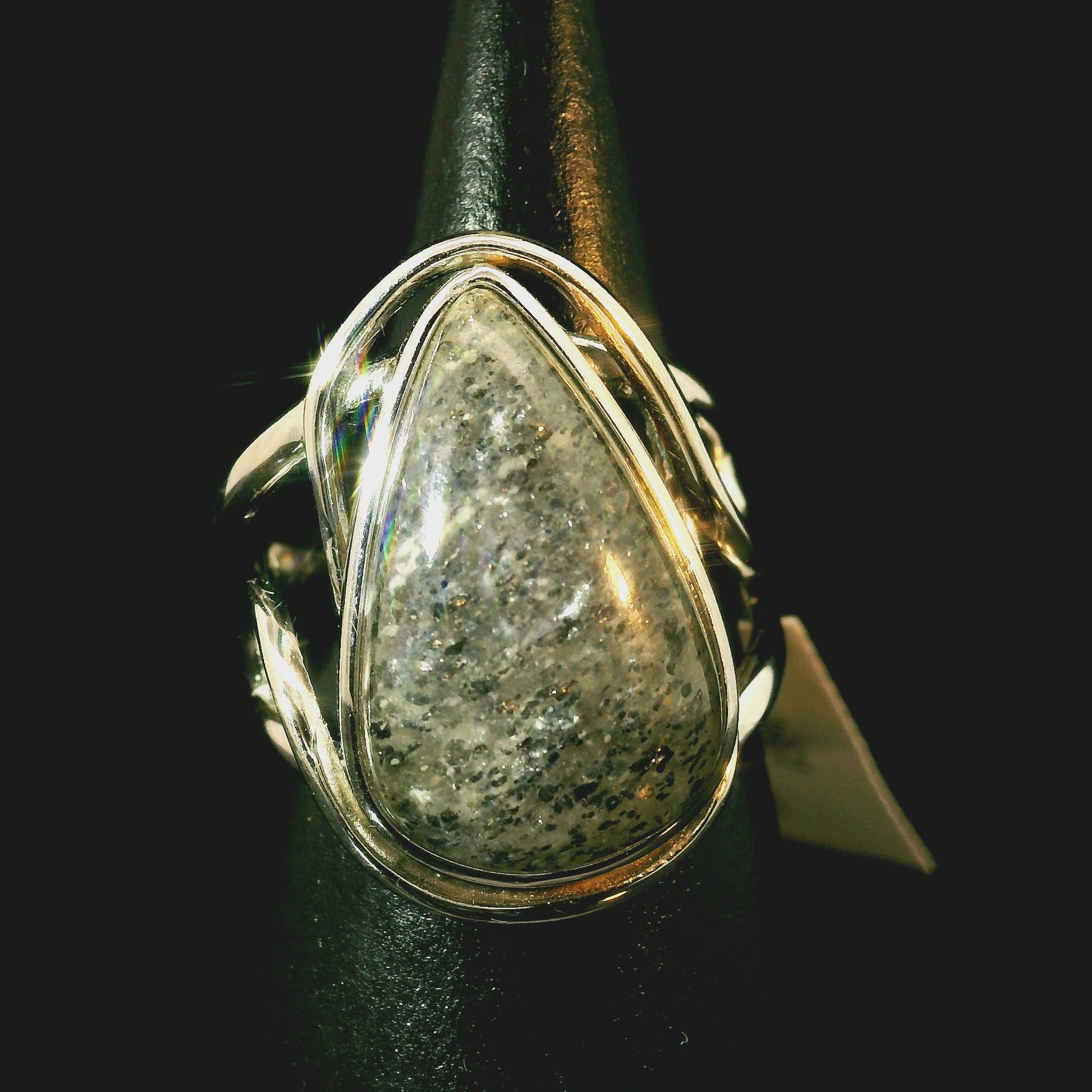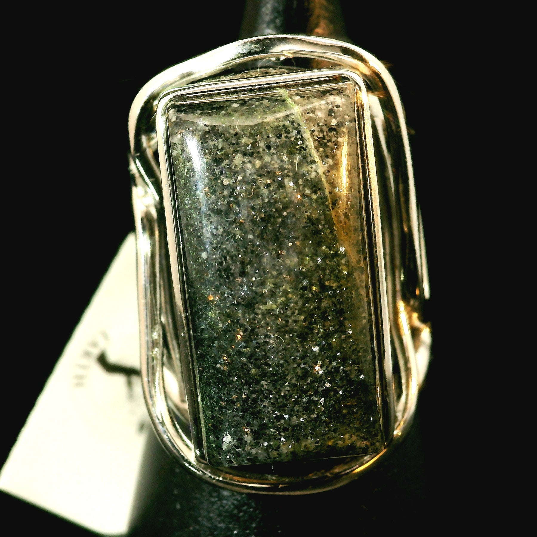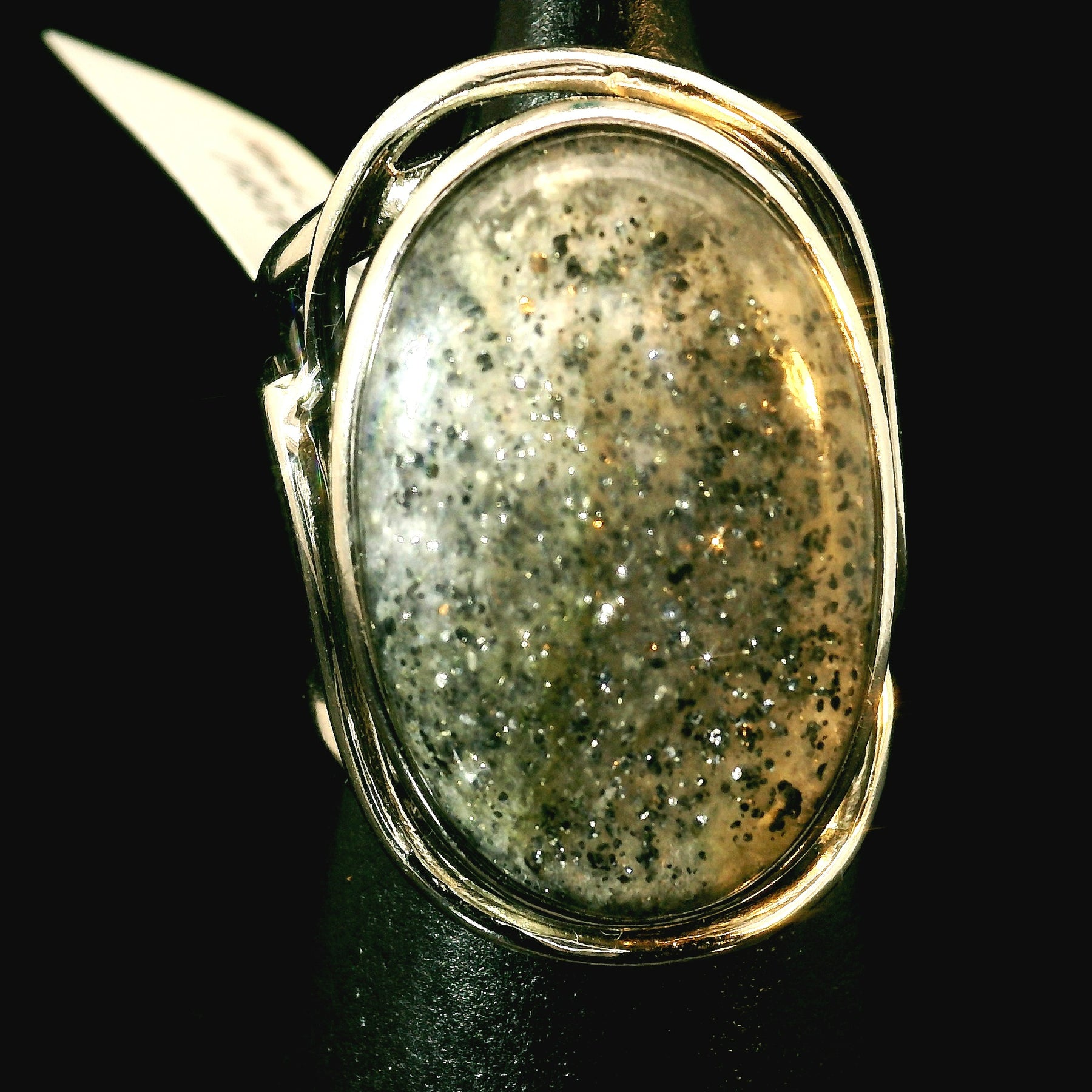 Stunning, high quality Black Sunstone has been hand selected by Rick and Jamie! Set in a tasteful rhodium plated, .925 sterling silver setting, this will be a beautiful heirloom in your collection to enjoy for generations!