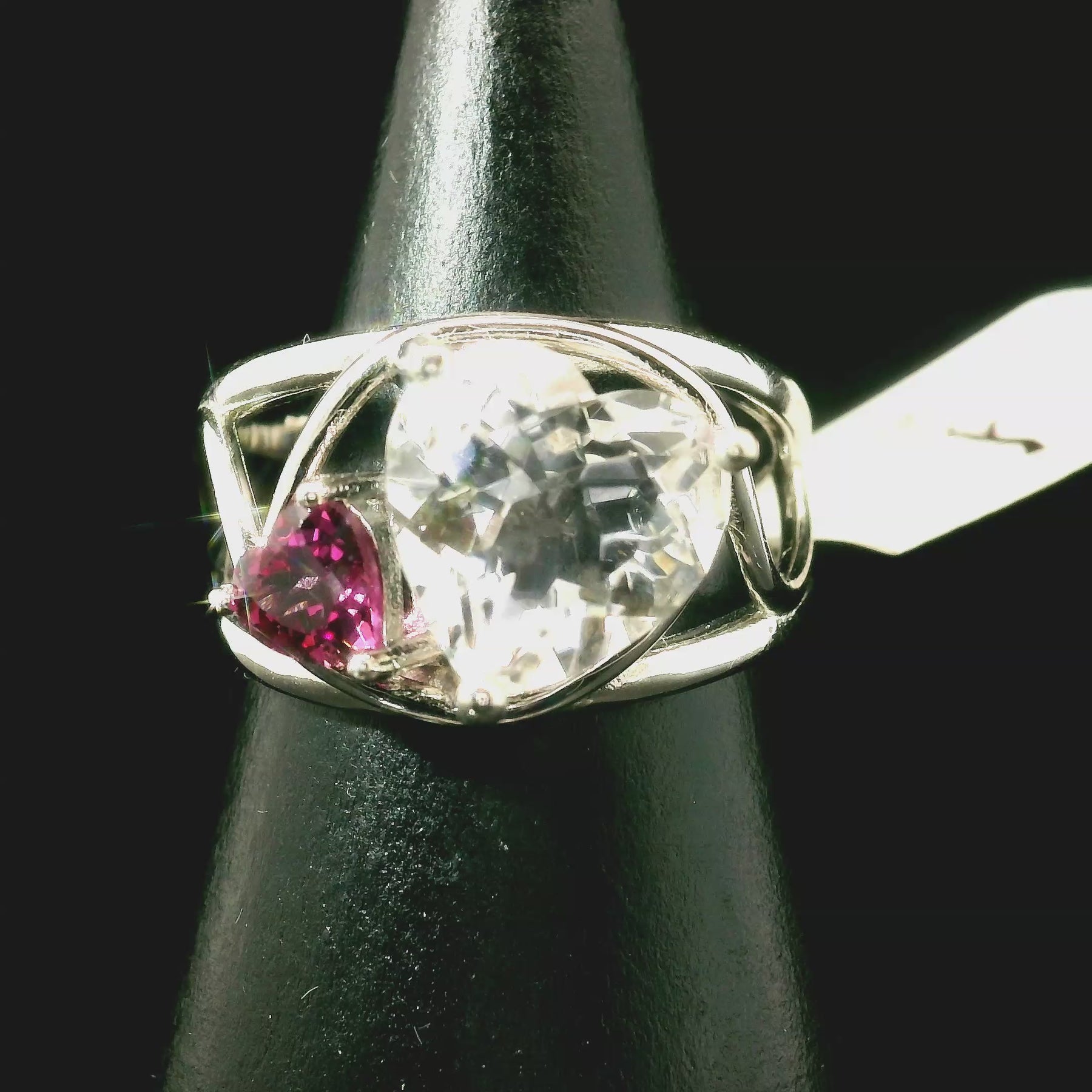 Stunning high quality Clear Quartz and Pink Tourmaline has been hand selected by Rick and Jamie! Set in a tasteful rhodium plated, .925 sterling silver setting, this will be a beautiful heirloom in your collection to enjoy for generations!