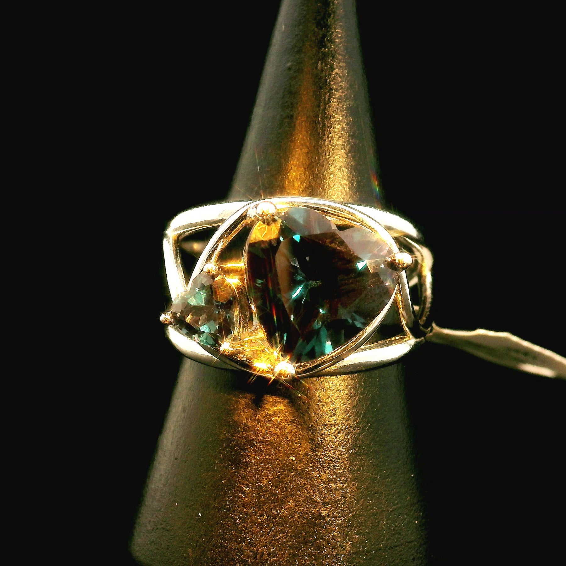This gorgeous color changing ring is not only beautiful but the properties are amazing it has healing energy to calm us when we get overwhelmed or worked up it helps self-confidence and self-esteem. Alexandrite brings good luck and good fortune it guides intuition and allows you to see both sides of any argument its great for healing broken relationships and showing you how to enjoy life more.