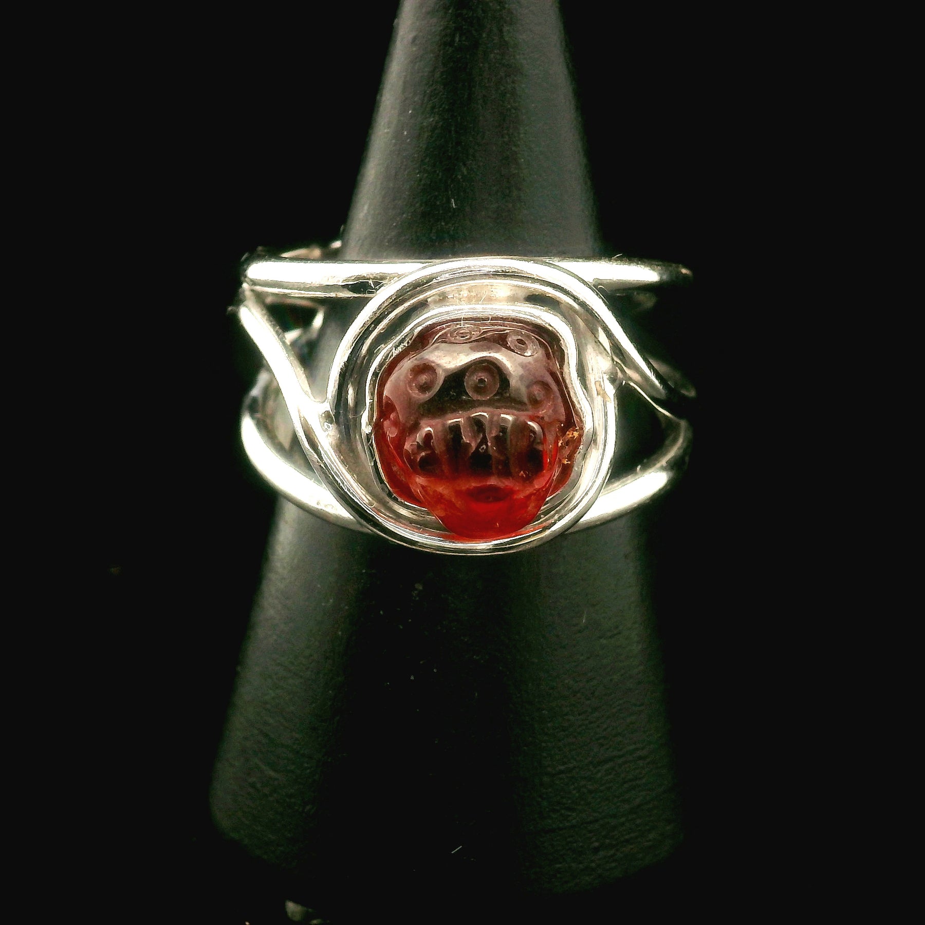 Absolutely enchanting Hessonite Garnet Money Toad Cuff Ring in rhodium plated, .925 Sterling Silver. Adjustable ring fits sizes 4-11.