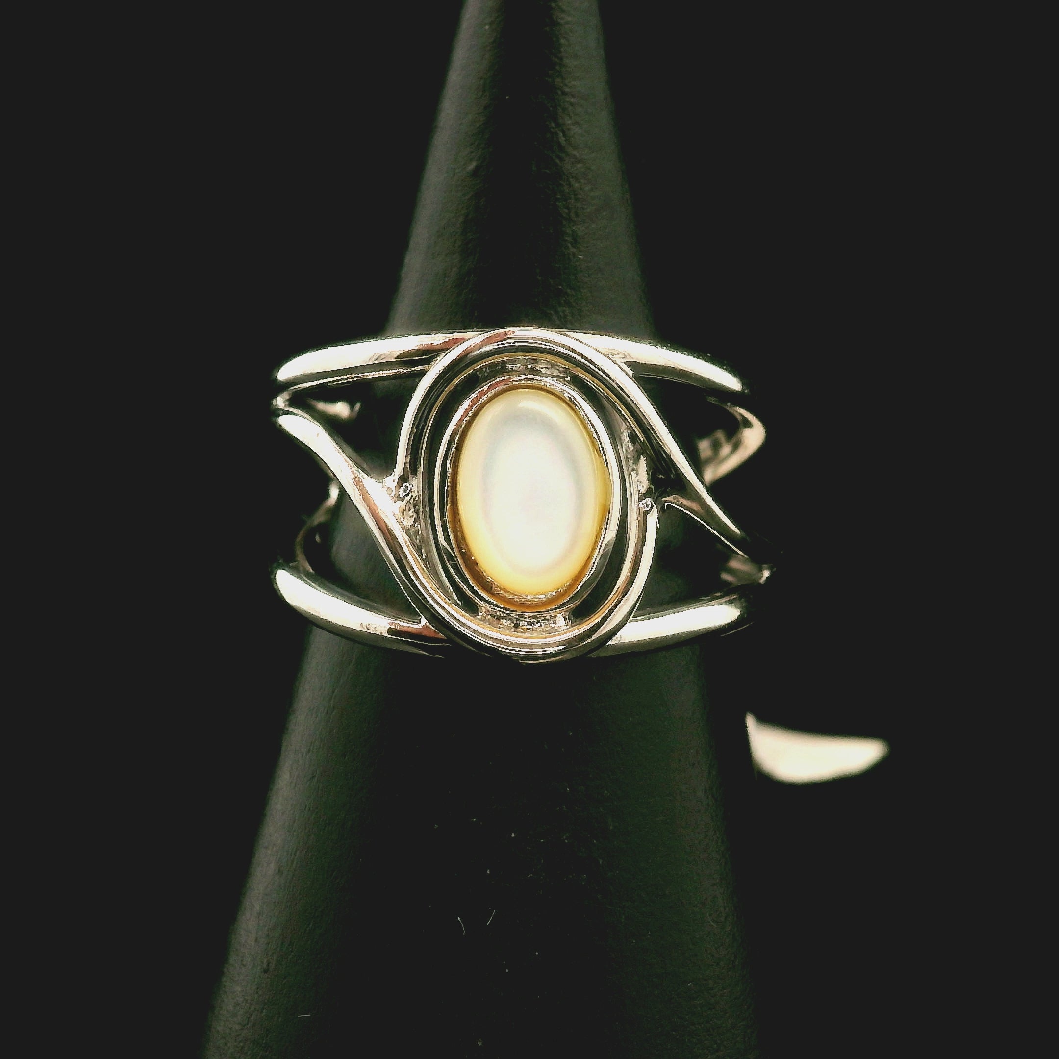 Mother of Pearl, also known as Nacre, is an irredescent material produced by some molluscs as an inner shell layer. Pearls and Mother of Pearl are formed by marine oysters and freshwater mussels as a natural defense against an irritant such as a parasite entering their shell or damage. Mother of Pearl is composed of hexagonal platelets of Aragonite and is the same material of which Pearls are composed of. Mother of Pearl's iridescent effect is caused due to the size of these platelets is close to the wavelength of visible light, resulting in diffraction in different directions for different wavelengths (colors) of light.