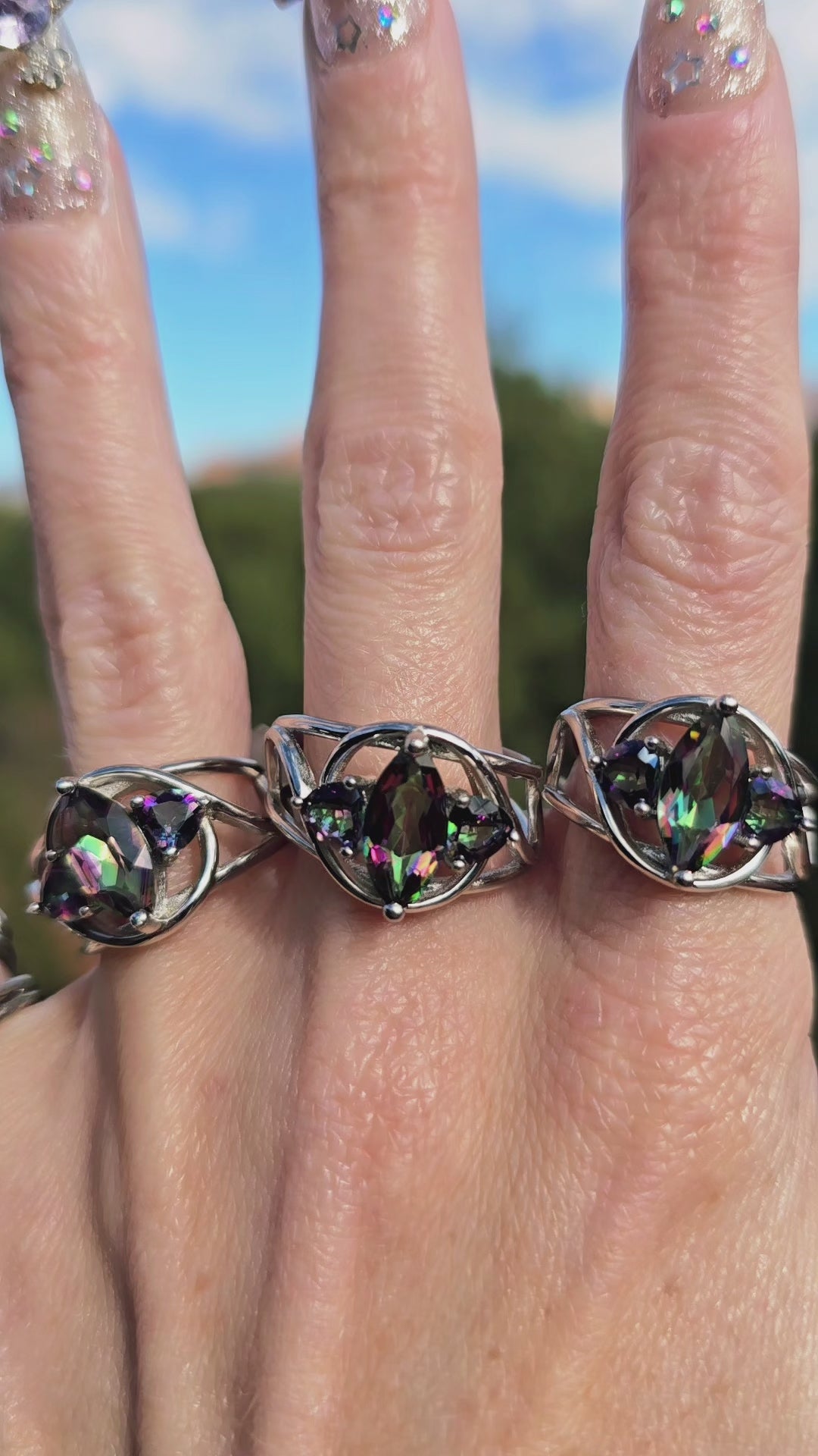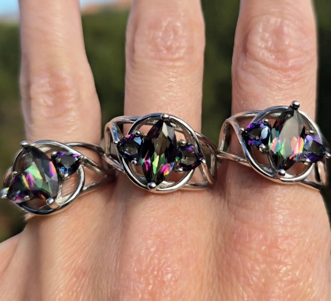 Mystic Topaz is an enchanting gemstone renowned for its dazzling play of colors! Its a variety Topaz that has undergone a special treatment to enhance its color and brilliance. While natural Topaz is a transparent gemstone that ranges in color from pale blue to golden brown, Mystic Topaz is created through a process called vapor deposition. This treatment involves applying a thin layer of titanium and other metallic elements to the surface of the gemstone. The result is a striking display of iridescent colors that change depending on the angle of light, giving Mystic Topaz its distinctive, color-changing appearance. Mystic Topaz is primarily composed of aluminum fluorosilicate (Al₂SiO₄(F,OH)₂), the same as natural Topaz.