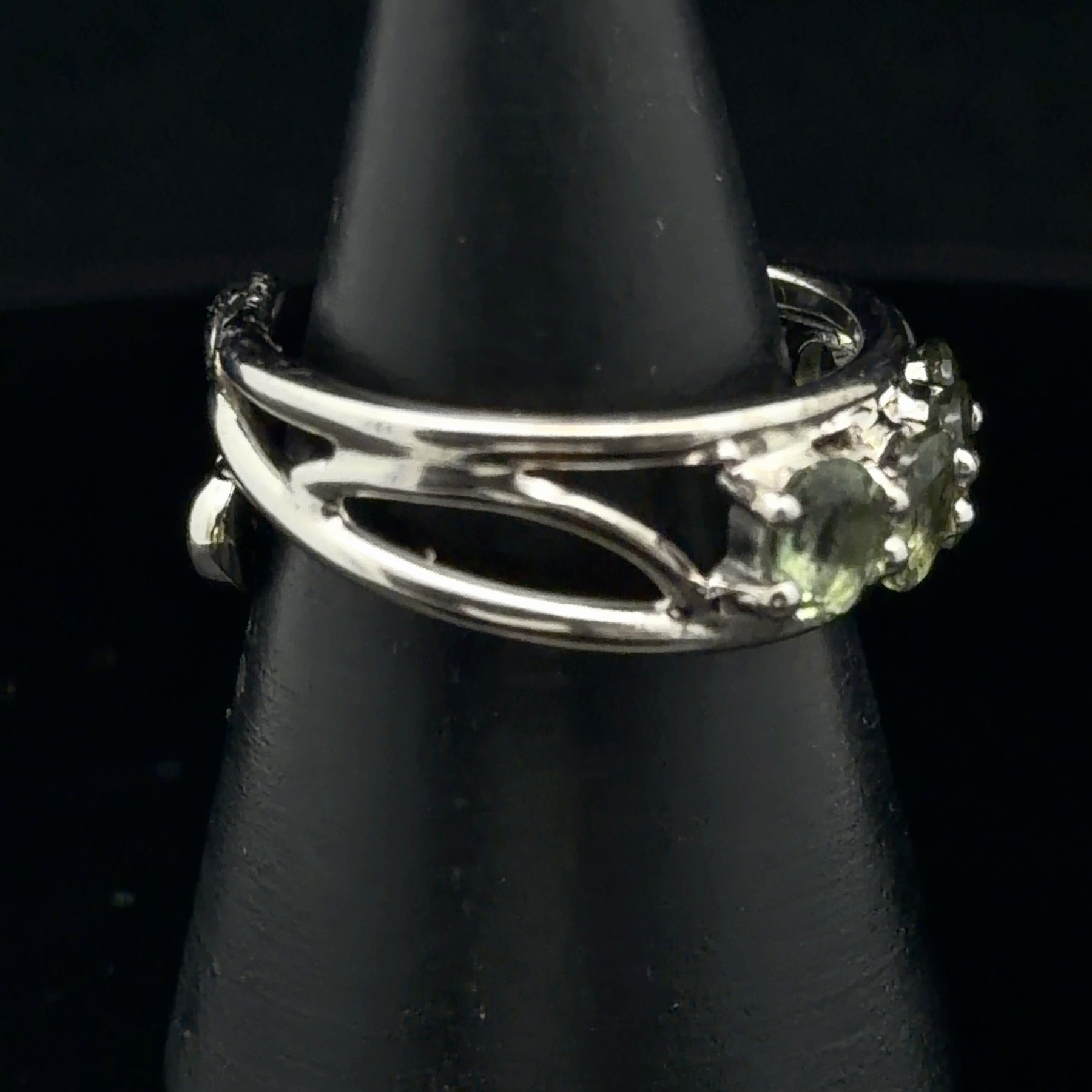 Stunning, high quality gemmy Moldavite Cuff Ring in rhodium plated, .925 Sterling Silver. Adjustable ring fits sizes 4-11.