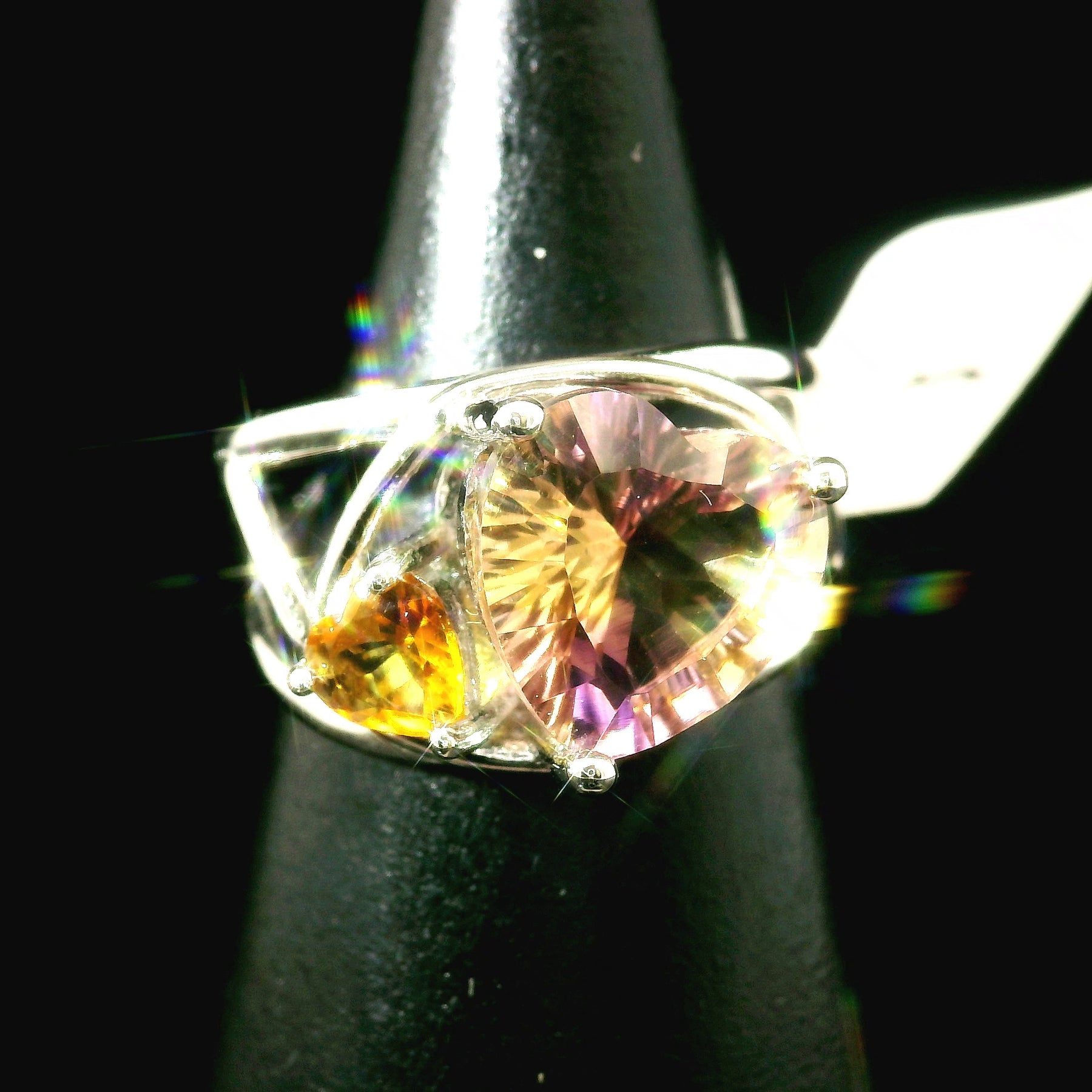 Stunning high quality Ametrine and Citrine has been hand selected by Rick and Jamie! Set in a tasteful rhodium plated, .925 sterling silver setting, this will be a beautiful heirloom in your collection to enjoy for generations!
