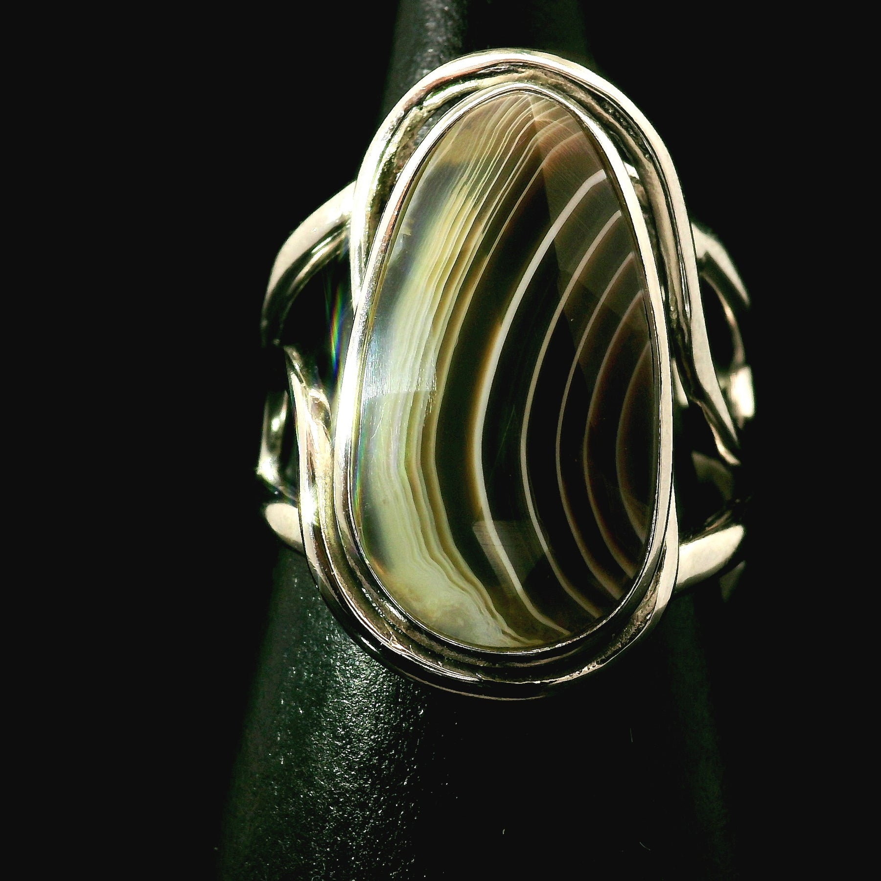 Absolutely incredible Botswana Agate Cuff Ring in rhodium-plated .925 Sterling Silver. Adjustable from sizes 4–11.
