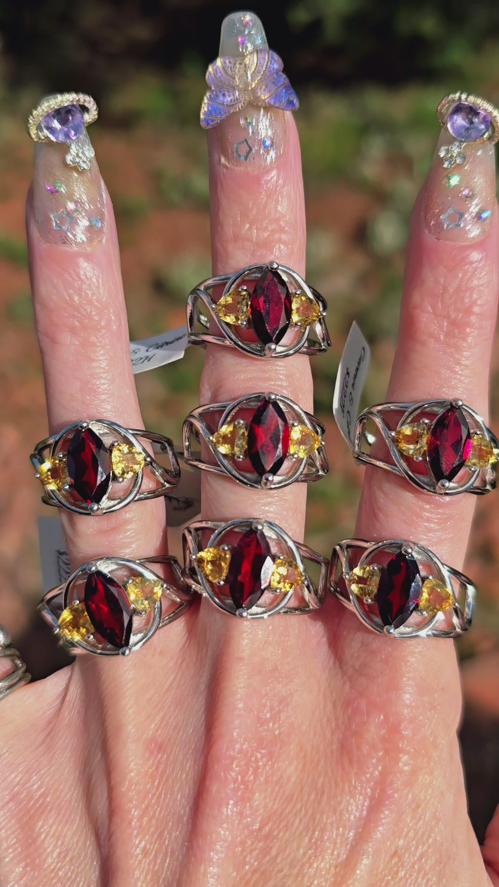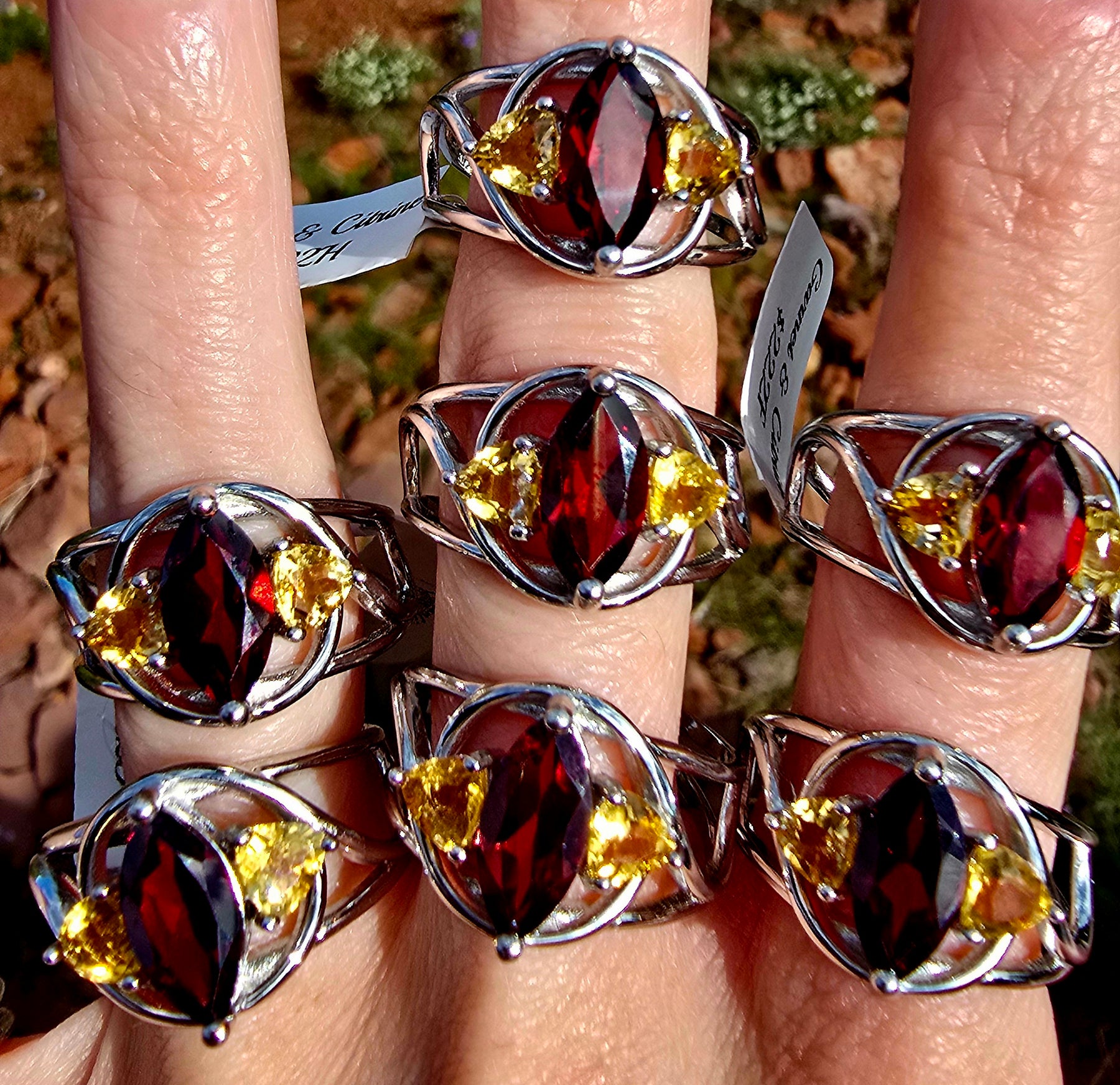 Absolutely beautiful Garnet & Citrine Adjustable Ring in .925 Sterling Silver. Adjustable ring fits sizes 4-11.